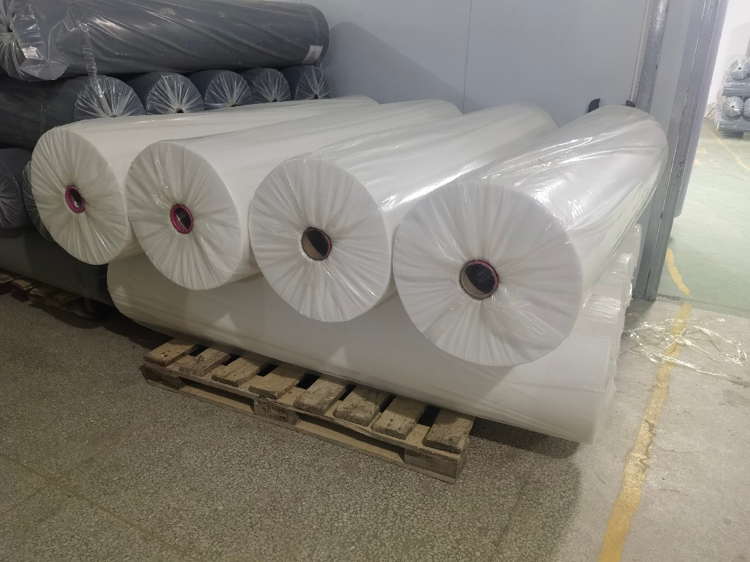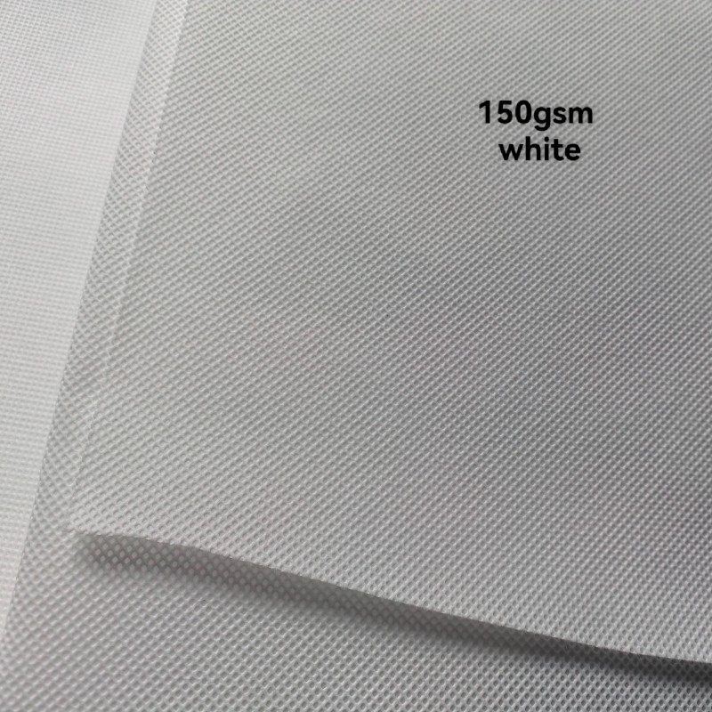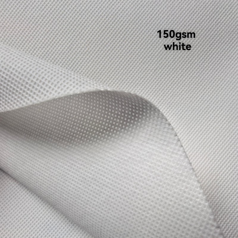 Rollo de tela no tejida de polipropileno spunbond de color blanco, 150 gramos por metro cuadrado.